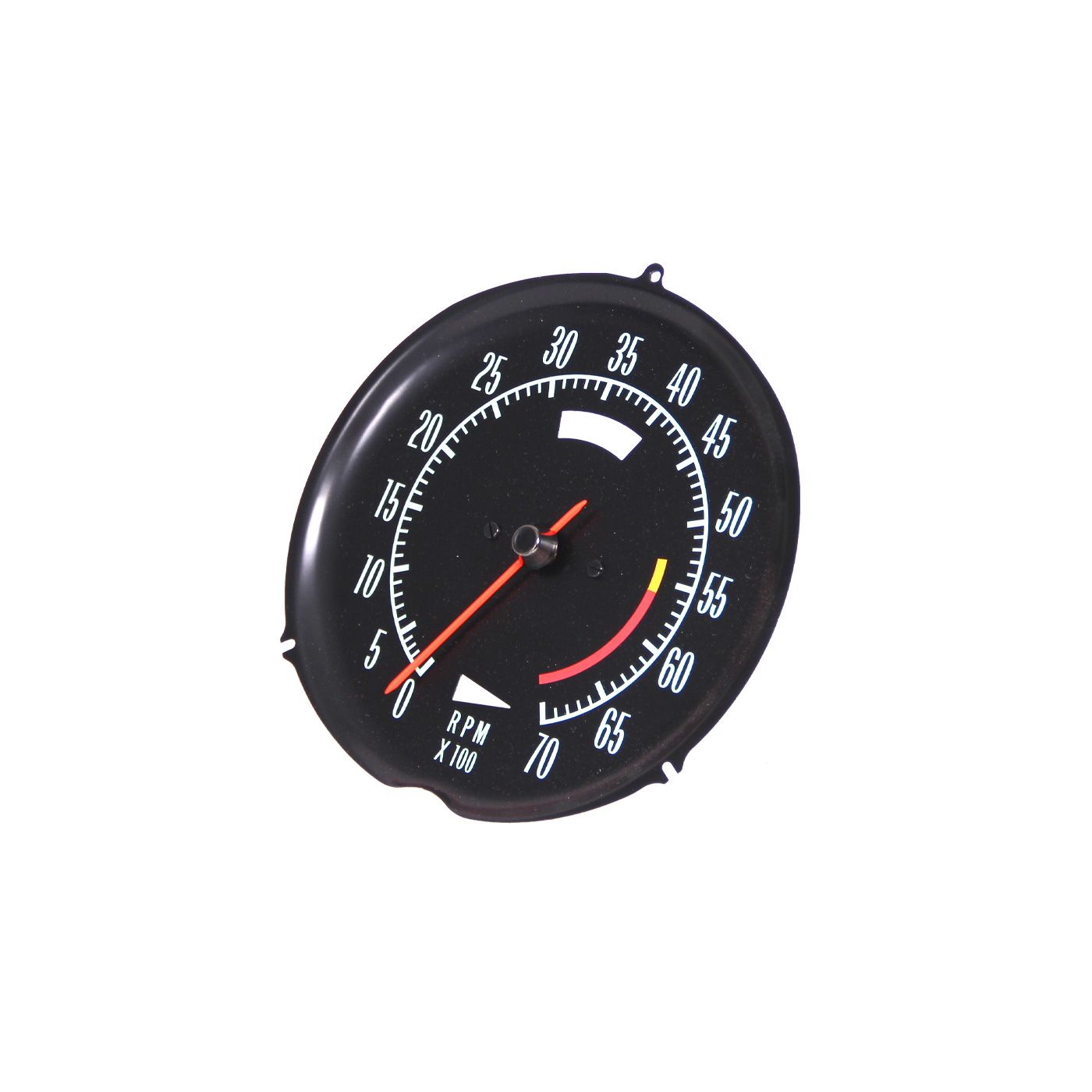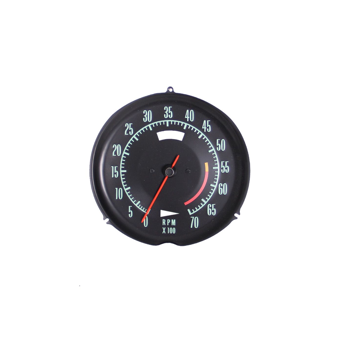 New reproduction 1968 Corvette tachometer, manufactured by an OEM supplier. Includes correct color “green” characters and dial, original background color and aluminum pointer. 5600 rpm redline face is attached with flat head slotted screws as original. Tachomter cable attaches by threading on to tachometer frame.