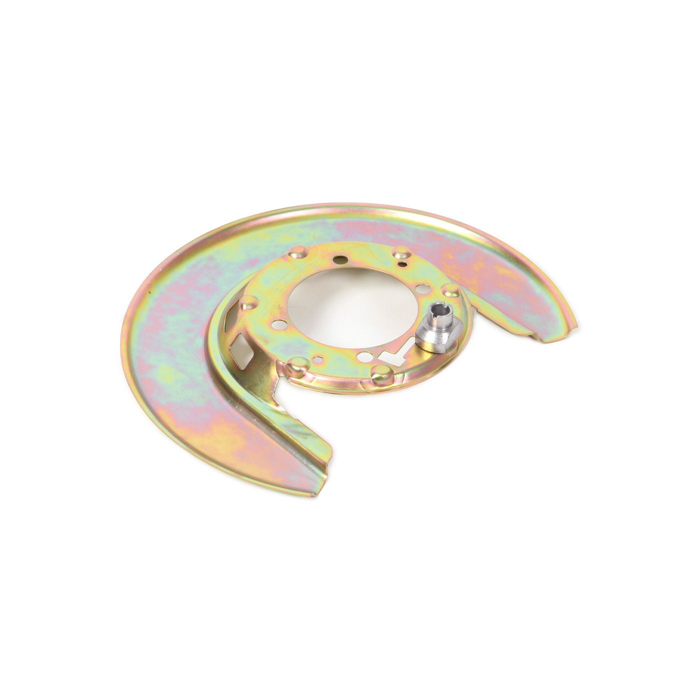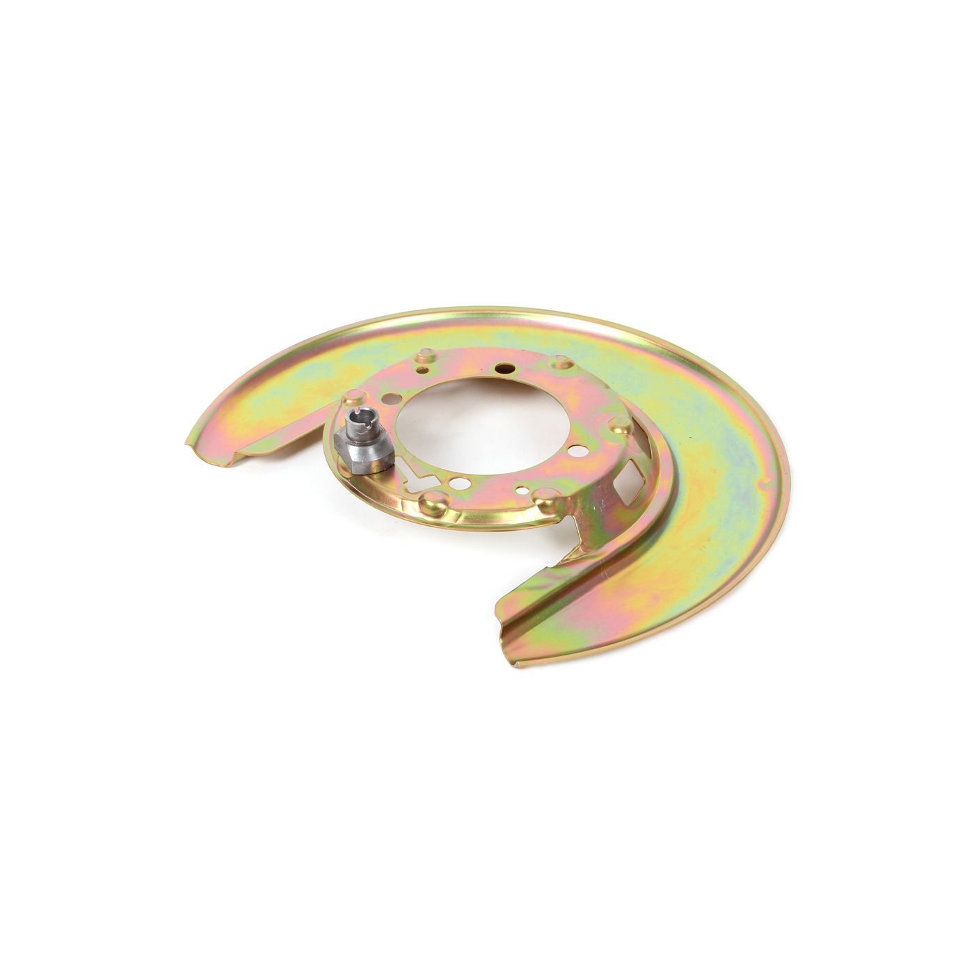 New reproduction 1977-1982 Corvette rear park brake or trailing arm backplate. Includes brake shoe anchor staked on backplate. Made in the USA backplates feature correct zinc dichromate gold finish found on later C3 Corvettes. The original GM part number is stamped into the backplate.