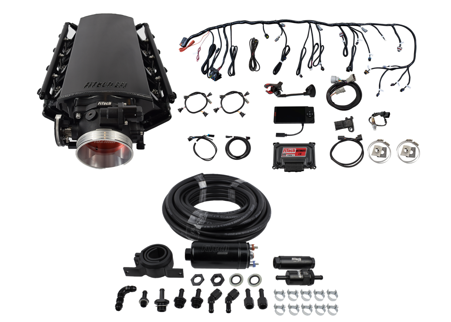 FiTech?s black anodized Ultimate LS1/LS2/LS6 500HP Kit with trans control combined with an Inline Fuel Pump fuel delivery kit are a complete self-tuning induction systems for LS engines designed for the do-it-yourself hot rodder to the professional EFI tuner! This system is ready to go with everything needed to complete the induction system of your LS engine and get you on the road easily and faster than any system on the market today. Forget sourcing mismatched parts and cutting and splicing old harnesses and re-flashed ECU?s from ?Craigs List? tuners.