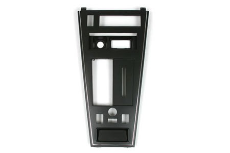 Nieuwe reproductie 1981-1982 Corvette console bovenste sierplaat. Zwarte kunststof bovenste sierplaat met buitenste chromen rand omgeeft de shifter en omvat de asbakbehuizing.