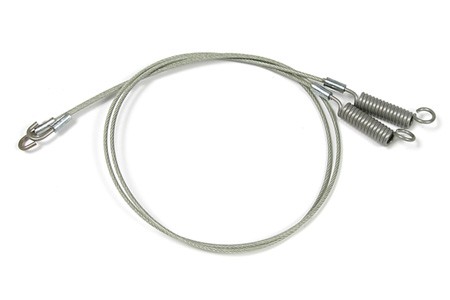 Nieuwe reproductie 1986-1993 Corvette convertible top side tension cables. Kabels worden bevestigd aan de zijrail van het frame en houden spanning op het frame terwijl de bovenkant naar beneden wordt getrokken. Roestvrije kabel met trekveer. Verkocht in paren.